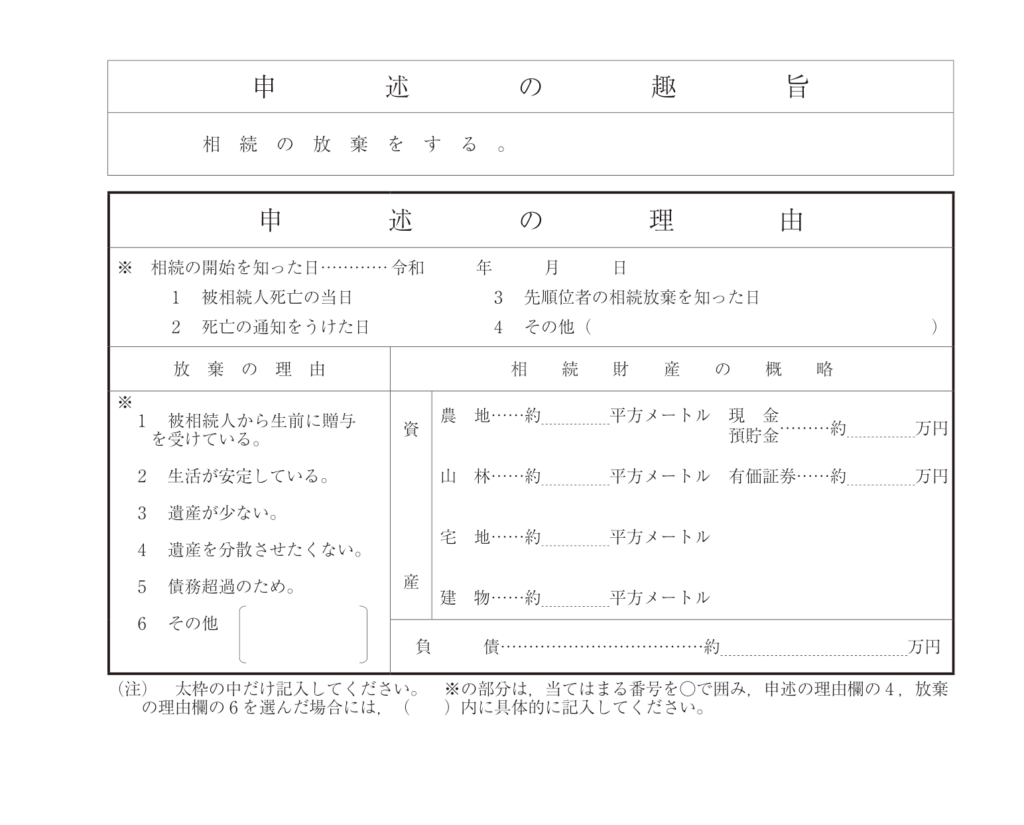 申述の理由相続放棄をする理由を以下の選択肢から選びます。通常は「被相続人の債務が超過している」を選択します。