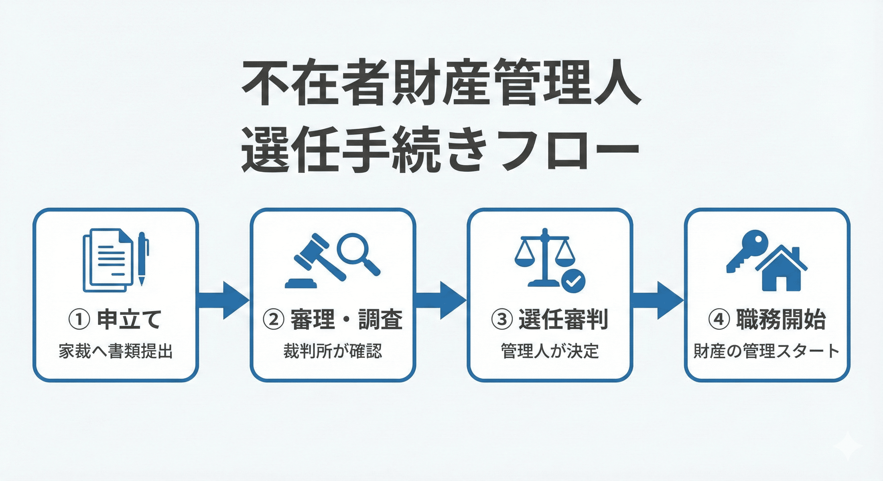 不在者財産管理人の選任は、家庭裁判所への申立てによって行われます。