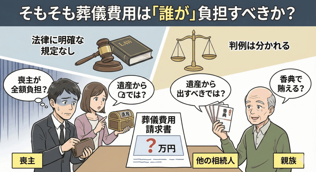「そもそも、葬儀代って遺産から出していいの? 喪主(長男)が自腹で払うべきじゃないの?」 この点については、法律には明確な規定がなく、裁判例も分かれています。
