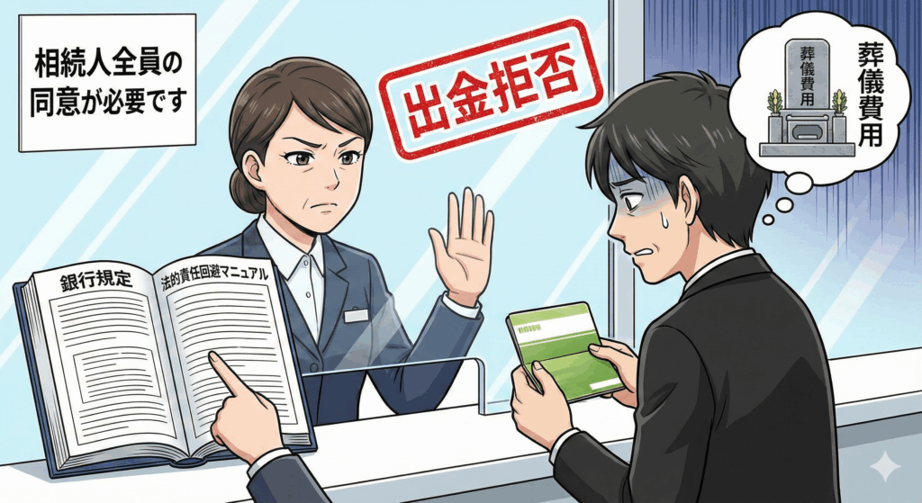 銀行は、このような**「相続トラブルへの巻き込まれ」を回避するため**、名義人の死亡を知った時点で口座をロックし、一切の出金を停止するのです。