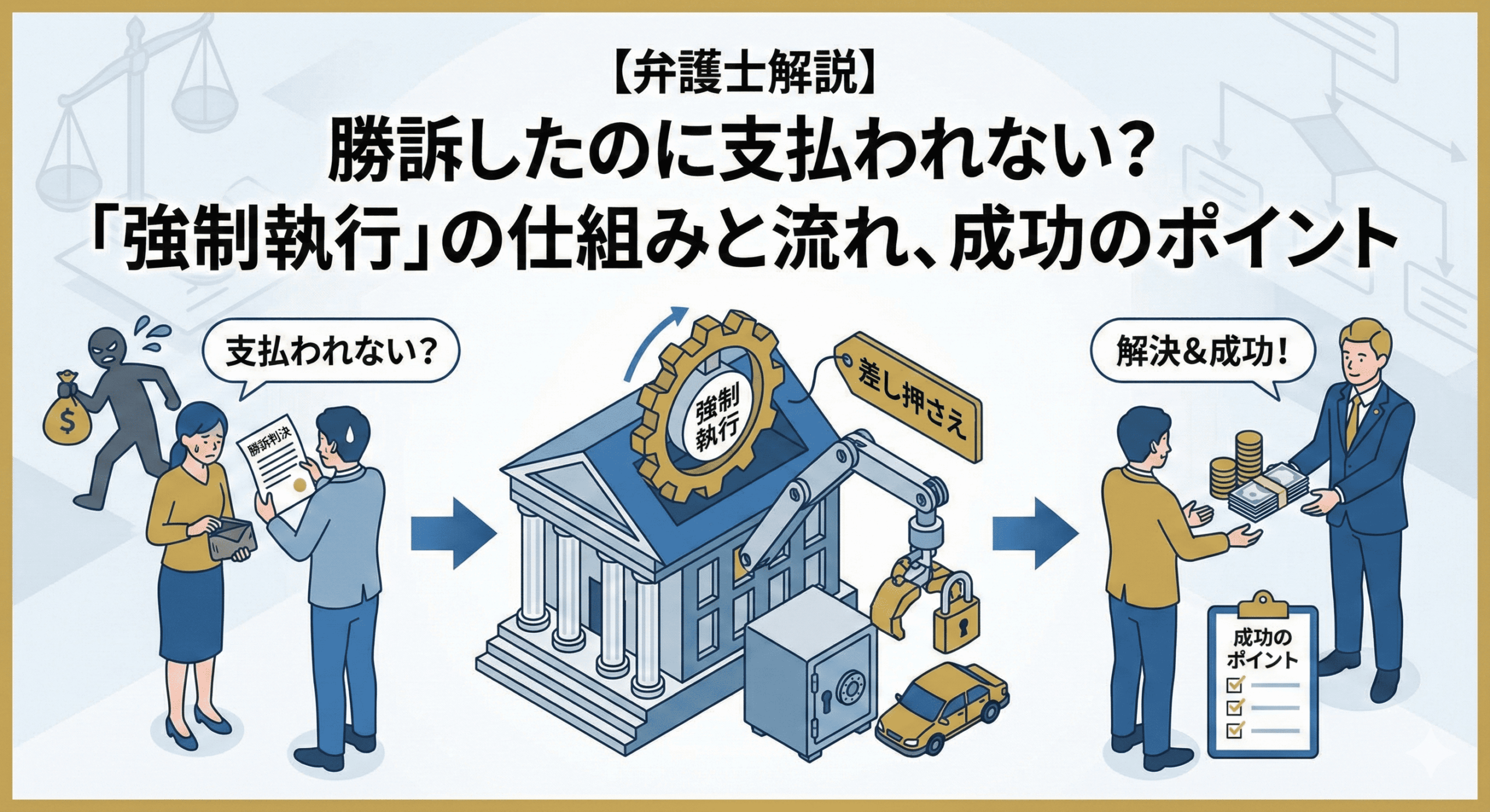 裁判で勝訴判決を得たり、相手方と和解が成立したりしても、相手が約束通りにお金を支払ってくれない――。残念ながら、こうしたトラブルは少なくありません。そのような場合に、国(裁判所)の力を借りて、相手の財産から強制的に回収する手続きが**「強制...